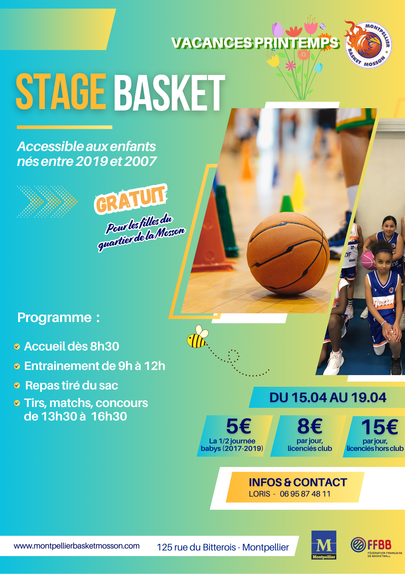 Tarif/jour : 0€ (filles du quartier de la Mosson) – 8€ licenciés club Mosson –  15€ hors club